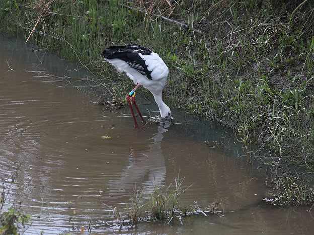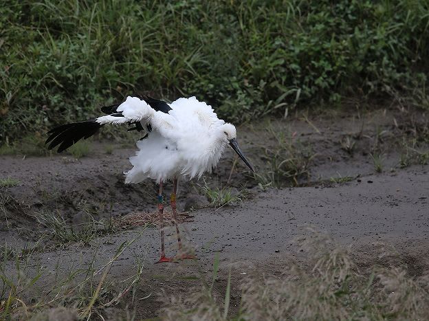 胸部に襟巻状の羽があります。成鳥は足が赤く、上面を覆う羽は白、翼の風切羽は黒ですが僅かに白い部分もあります。 電柱の上などに草やワラで巣を作り、2〜6個の卵を産み育てます。 | ||||||